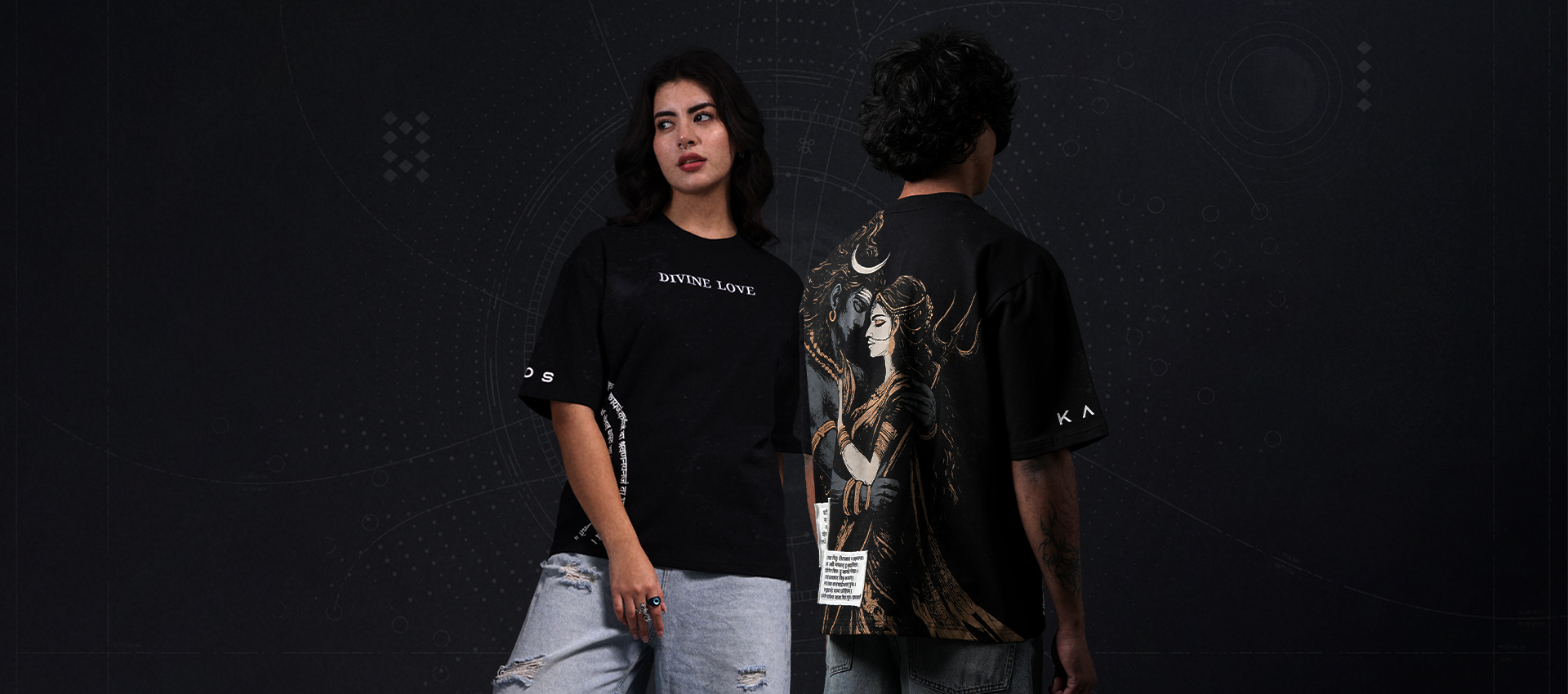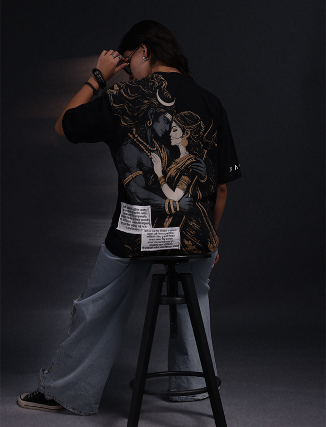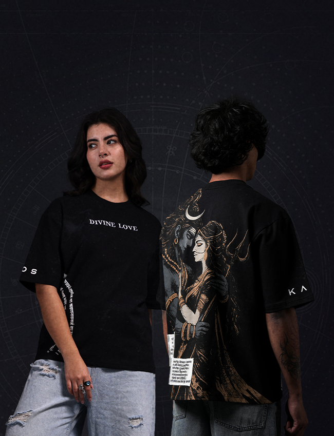 Reimagines the eternal bond of Shiva and Sati in Divine Love: a tribute to devotion that defies death, destiny, and time. It’s not just apparel — it’s a reminder that love can be fierce, raw, and beautifully destructive.